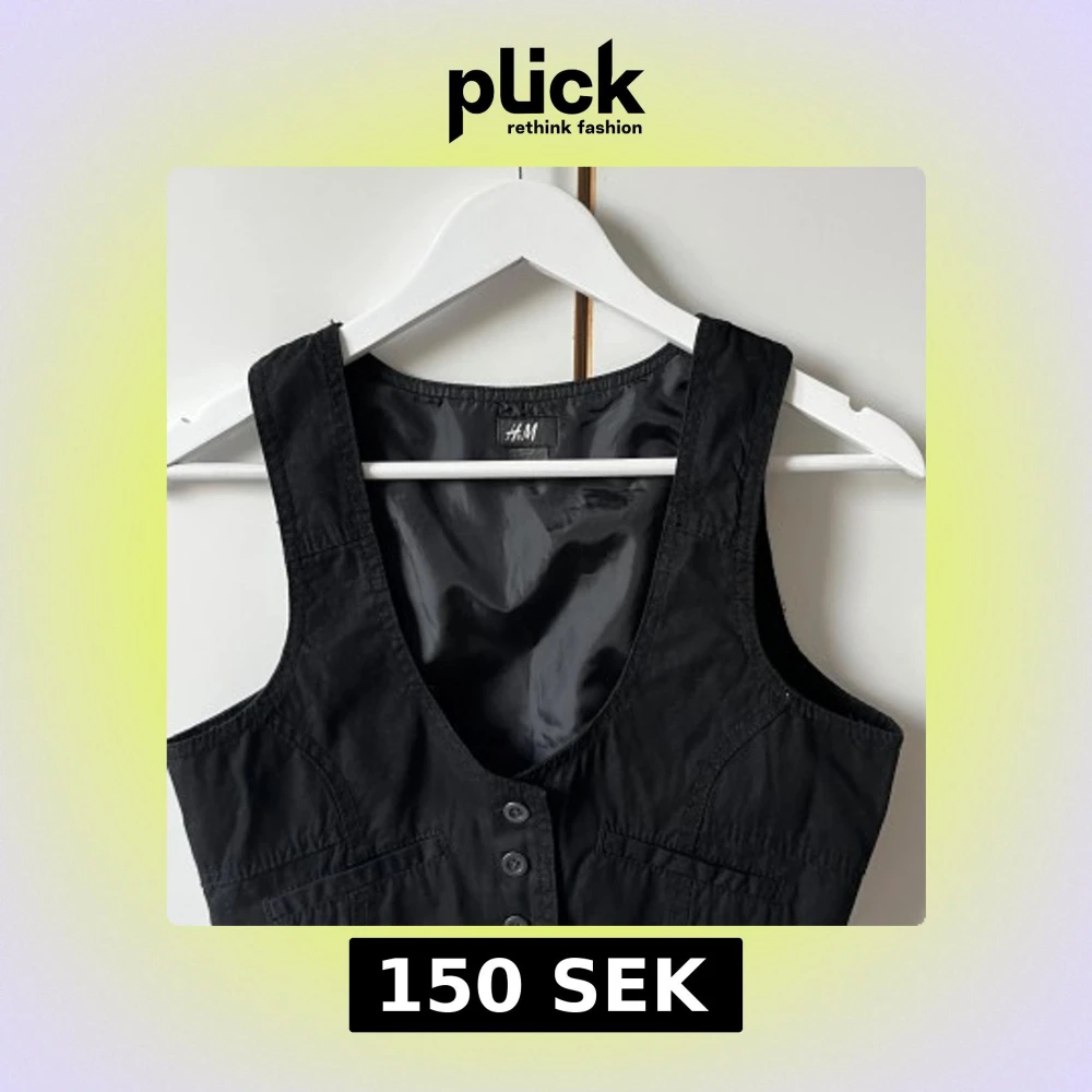 Svart väst från H&M i storlek 170. Västen har en klassisk v-ringad design med tre knappar framtill och två dekorativa fickor. Materialet är bomull och den har en stilren, enkel look som funkar till många outfits.