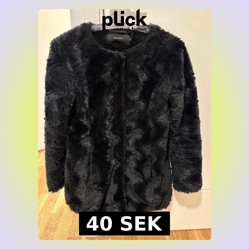 En välanvänd fuskpälsjacka från Vero moda. Försluts med knappar. Har två fickor. Det enda anmärkningsbara är att sömmen under ena ärmen släppte i jackans insida, och det har jag sytt för hand. Det är inget man märker av när man har på sig jackan. Har man en symaskin eller är mer händig än jag, kan man åtgärda det finare dock :) Likaså hade ena fickans söm släppt och det har jag också sytt för hand, det känns ojämnt om man har handen i fickan där jag har sytt för hand. Inget som syns utåt set