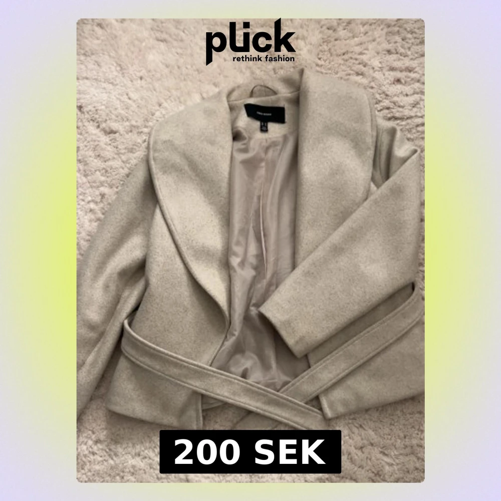 SÀljer en stilren beige kappa frÄn Vero Moda i omlottmodell med bÀlte i midjan. Jackan har stora slag, raka fickor och Àr helfodrad. Perfekt för dig som gillar minimalistisk och clean look. Passar till bÄde jeans och kjol.