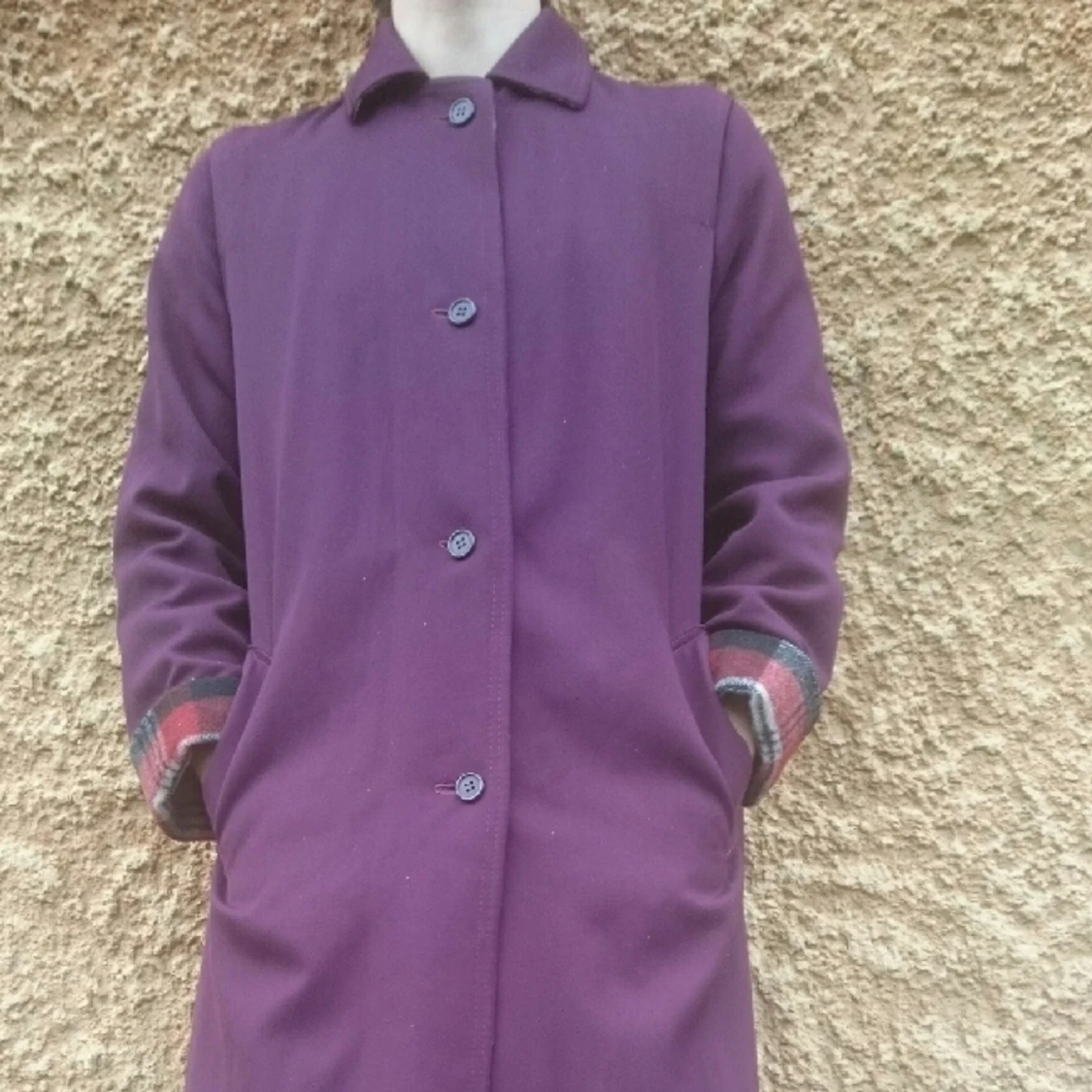 Elegant vinröd höstkappa med varmt rutigt foder i filt. Bra skick!