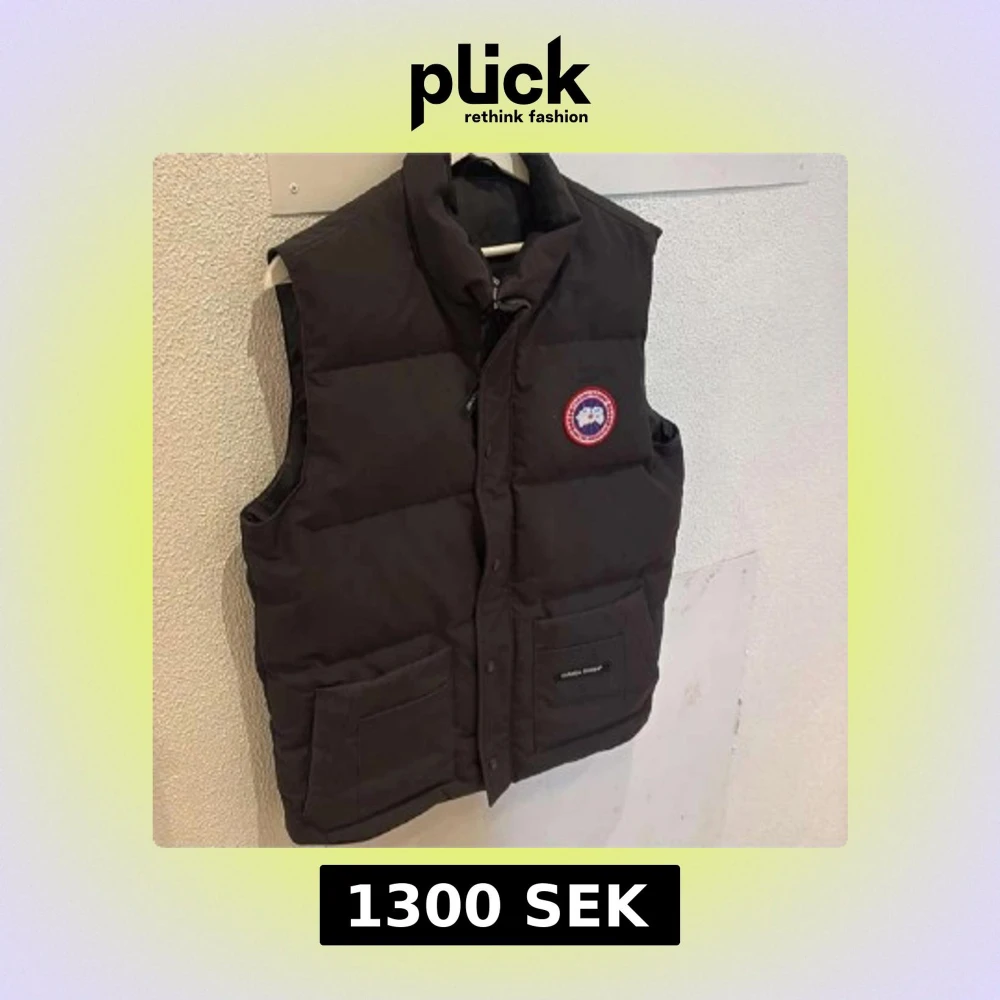 Säljer en svart dunväst från Canada Goose med deras ikoniska märke på bröstet. Västen har praktiska fickor och stängs med dragkedja och knappar. Perfekt för kyliga dagar.
