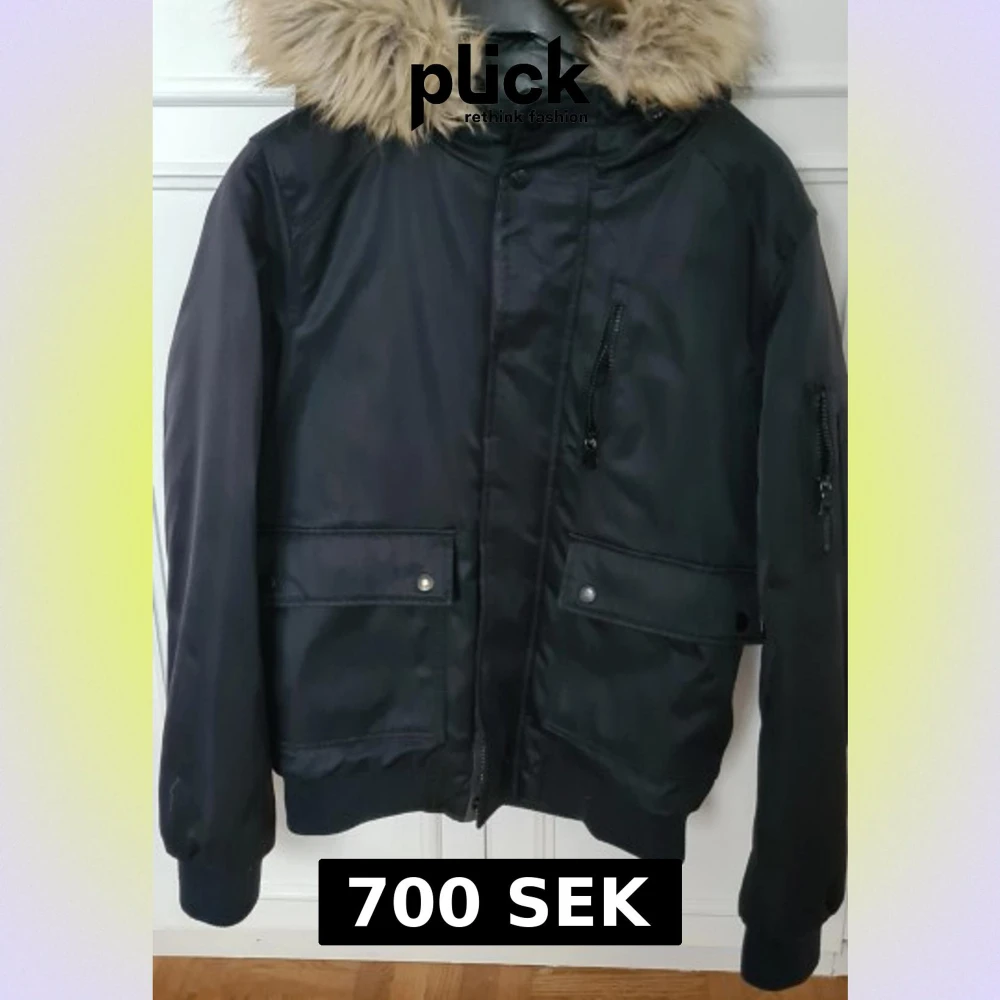 Svart bomberjacka med stor beige fuskpäls på huvan. Jackan har flera fickor med knappar och dragkedjor, samt ribbade muddar vid ärmslut och nederkant. Perfekt för kalla dagar och har en snygg, urban look. Den är i storlek S
