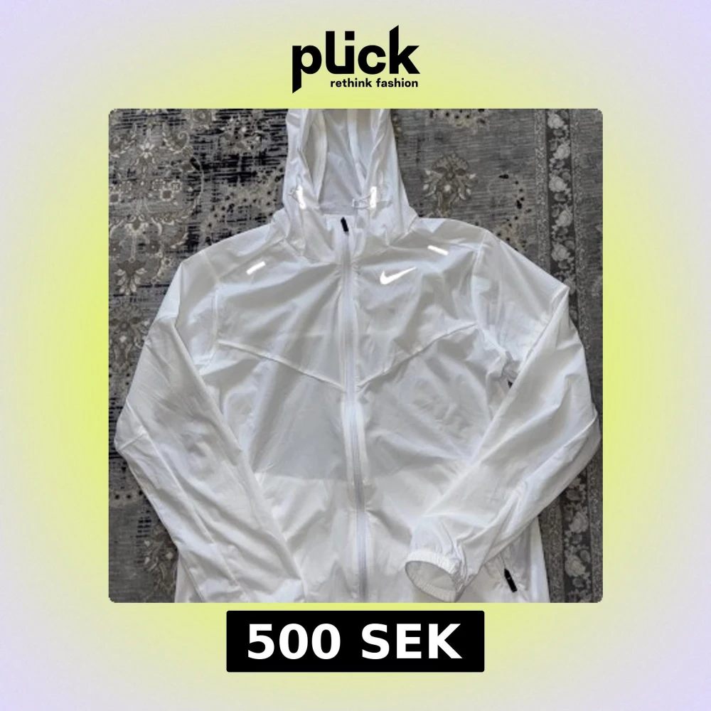 Snygg vit vindjacka från Nike med huva och dragkedja hela vägen. Jackan har två fickor med dragkedja och reflekterande detaljer på axlarna. Perfekt för blåsiga dagar och sportiga outfits.