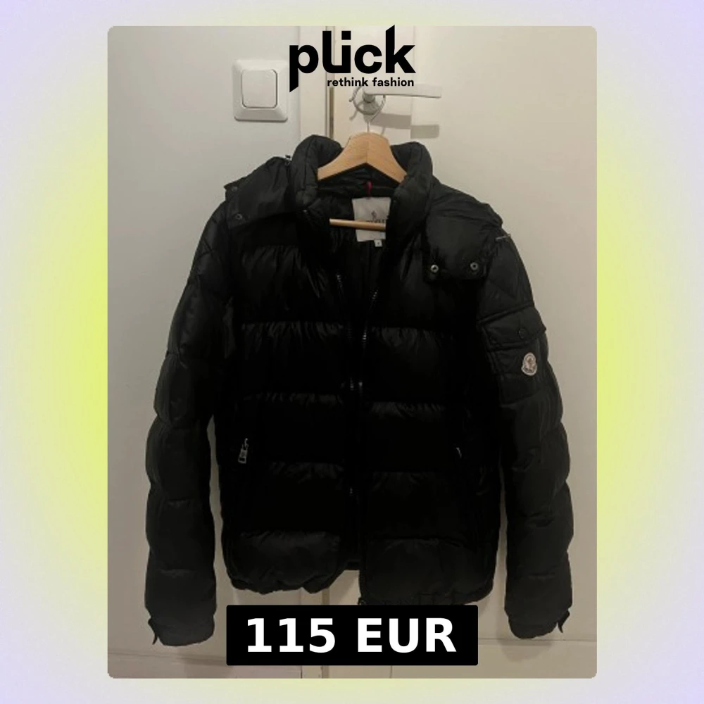 Svart pufferjacka från Moncler med klassisk logga på ärmen och snygga detaljer som ficka med knapp. Jackan har dragkedja framtill och är tillverkad i glansig syntet med dunfyllning. Perfekt för kalla dagar och har en modern, lite loose passform.