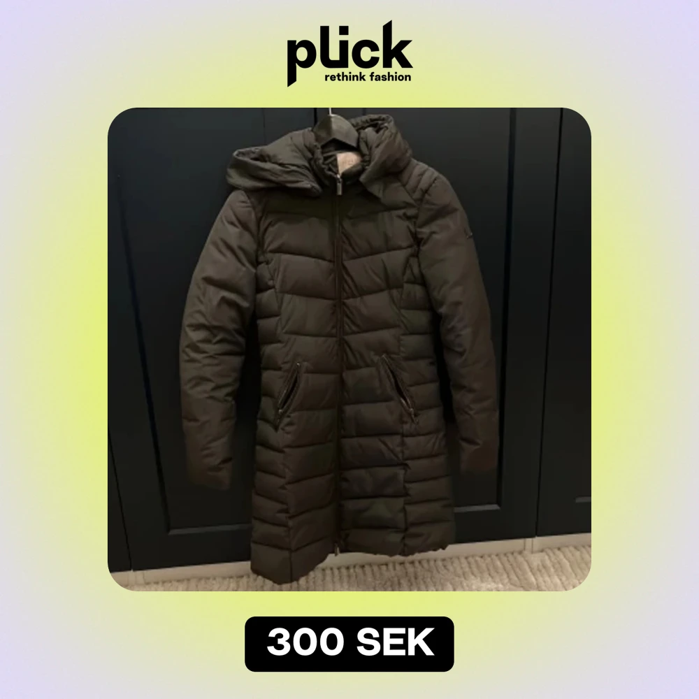 En lång och varm jacka från Livelo i storlek 34, passar mig som brukar ha XS/32. Lång ner till knäna (157cm) och värmer bra, finns dessvärre ingen päls till luvan!