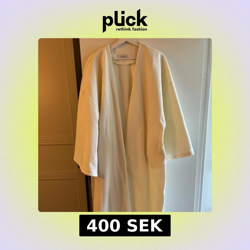 Säljer en stilren och lång vit kappa från New Collect. Jackan har en öppen framsida utan knappar eller dragkedja, med breda och raka ärmar. Materialet är strukturerat och ger en exklusiv känsla. Perfekt för dig som gillar minimalistisk och clean stil.