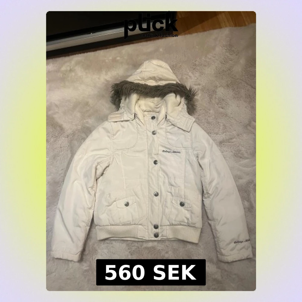 Snygg vit pufferjacka från College Athlete med huva och fuskpälsdetalj. Jackan har ribbade muddar, två fickor med knappar och både dragkedja och knappstängning framtill. Broderad logga på bröstet och ärmen. Perfekt för kalla dagar. Storlek 146