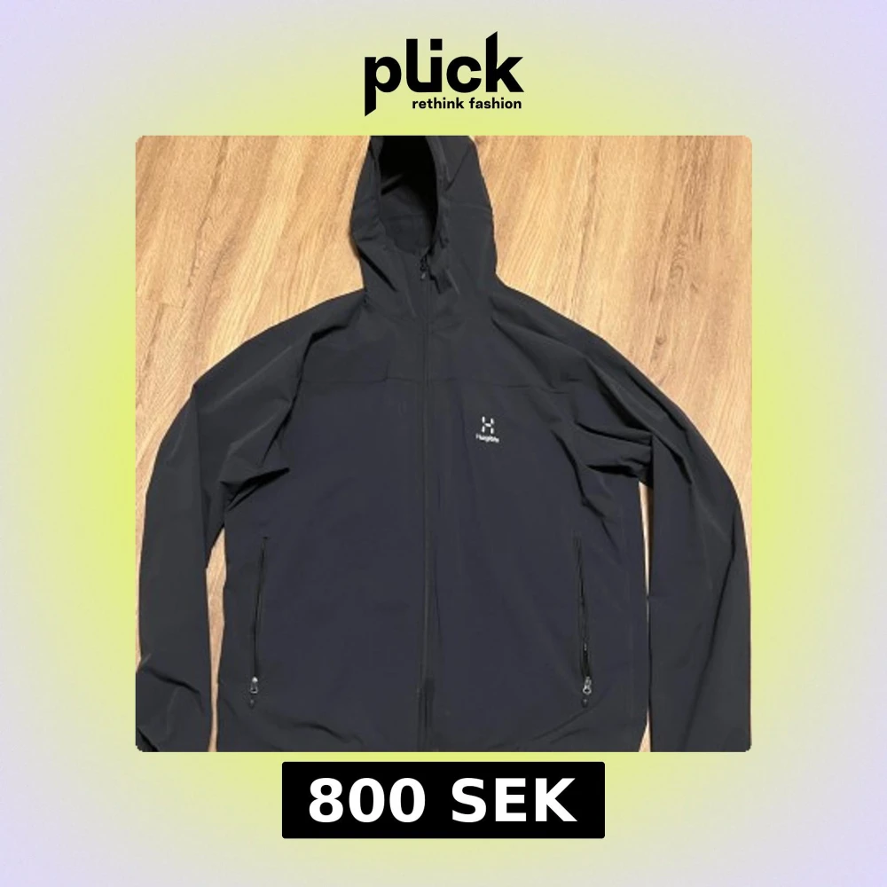Säljer en svart jacka från Haglöfs med huva och dragkedja. Jackan har två fickor med dragkedjor och är perfekt för utomhusaktiviteter. Den är långärmad och har en stilren design.