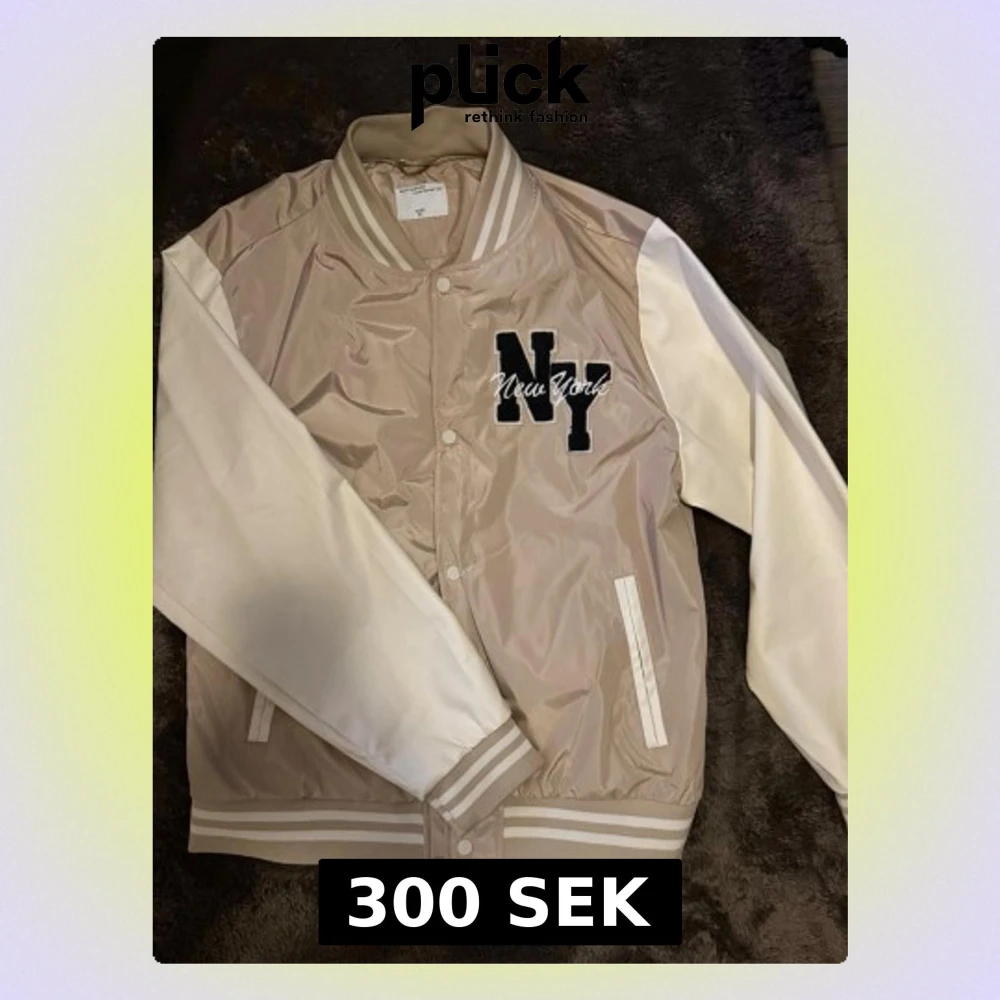 Snygg beige och vit bomberjacka från Riot Empire i storlek XL. Jackan har broderad NY-text på bröstet, randiga muddar och krage samt knappar framtill. Tillverkad i polyester med klassisk college-look och två fickor på sidorna.