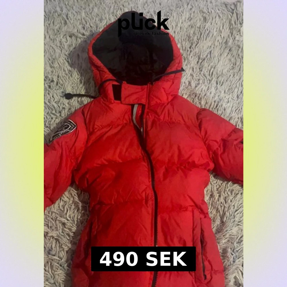 Säljer en röd pufferjacka i storlek XS. Jackan har huva, svart innerfoder, dragkedja framtill och en snygg patch på ärmen med texten 'Swedish Design Since 2006'. Perfekt för kalla dagar och riktigt skön att bära. skicka gärna prisförslag om ni har! btw jag postar alltid samma dag eller dagen efter!