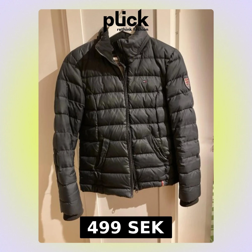 Snygg svart pufferjacka från Hilfiger Denim med quiltad design och hög krage. Jackan har dragkedja framtill, två sidofickor och ett broderat märke på ärmen. Perfekt för kalla dagar och riktigt stilren look.