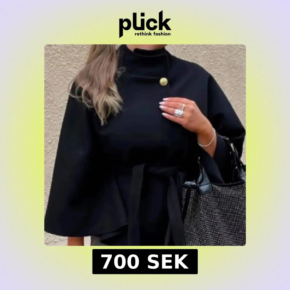Stilren svart kappa med hög krage, dekorativ guldig knapp vid halsen och knytbälte i midjan. Jackan har vida ärmar och en elegant, minimalistisk look som passar perfekt till höst och vinter.