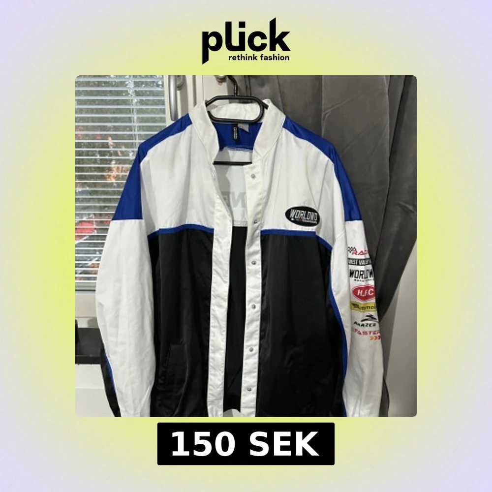 Snygg racinginspirerad vindjacka från H&M Divided i färgerna svart, vit och blå. Jackan har tryck med text och loggor på bröstet, ärmen och ryggen, samt knäppning framtill. Perfekt för dig som gillar streetstyle och sportig vibe.