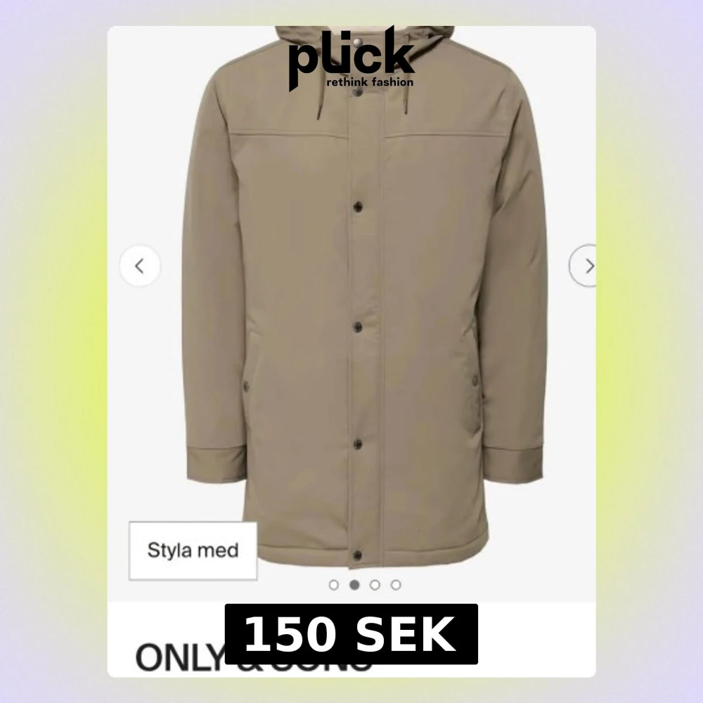 Säljer en beige parkasjacka från ONLY & SONS med huva och dragsko. Jackan har knappar framtill, två fickor med lock och en rak, längre passform. Perfekt för kyligare dagar och enkel att matcha med olika outfits.