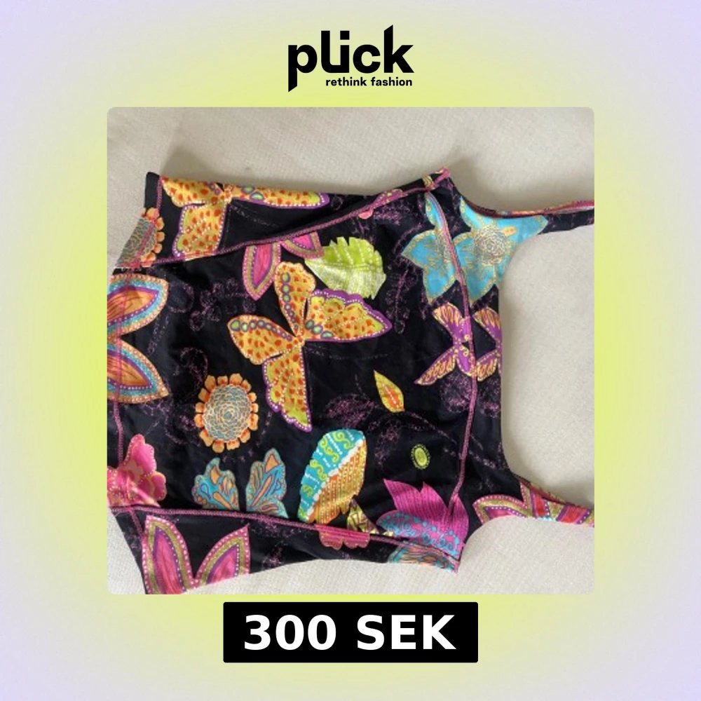 Superfin linnetopp från Fuego Woman med färgstarkt blommigt och fjärilsmönster i gult, orange, blått, rosa och grönt mot svart bakgrund. Toppens smala axelband och mjuka material gör den perfekt för varma dagar. Snygga kontrastsömmar i rosa längs kanterna.