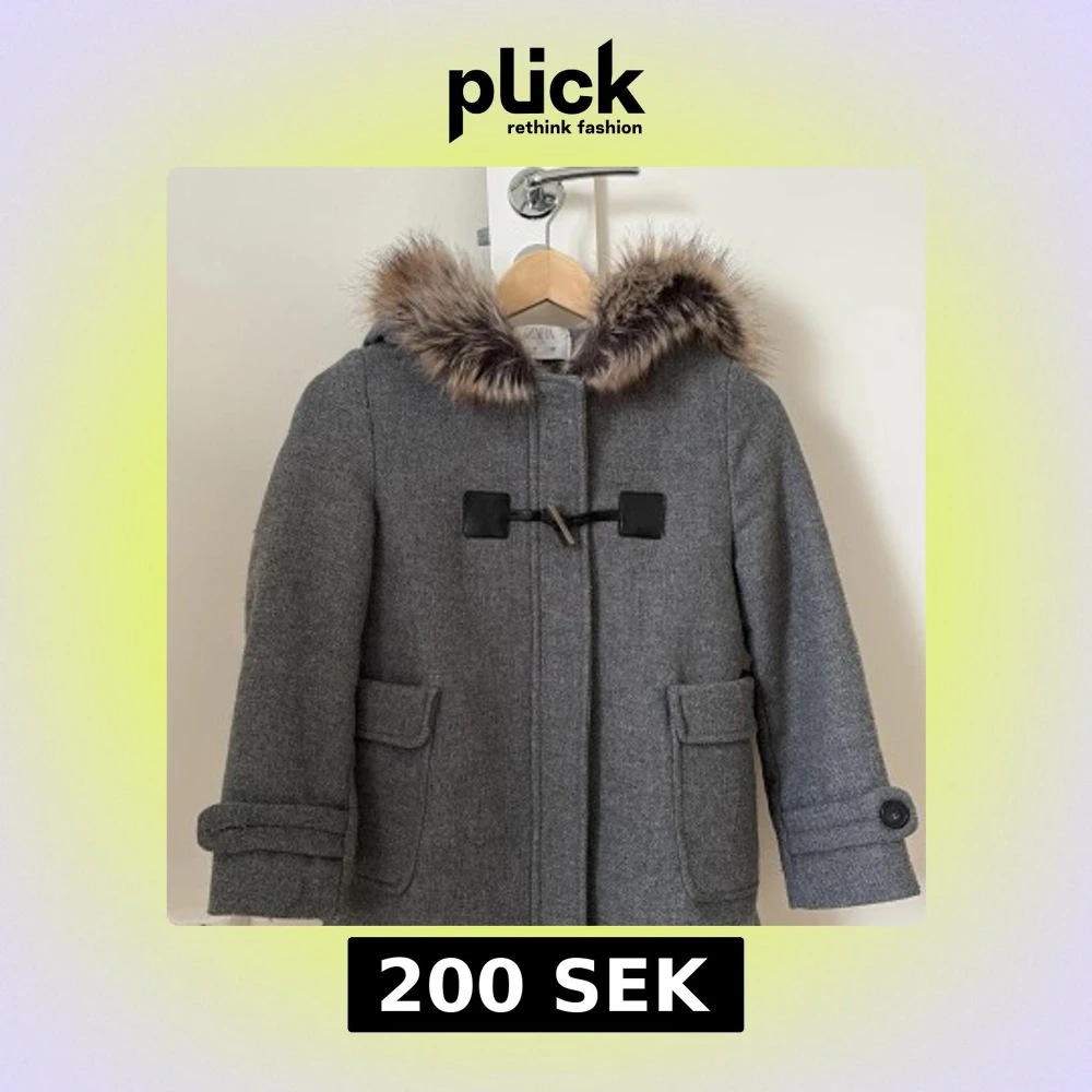 Snygg grå kappa från Zara med en mysig pälskantad huva. Jackan har en stilren design med knäppning framtill och praktiska fickor. Perfekt för kyliga dagar.köpte jackan för 400kr säljer nu för 200 vi kan diskutera på priset.