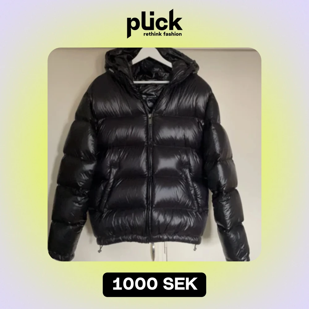 Svart vindjacka från Moncler med huva - Snygg svart vindjacka från Moncler med huva och dragkedja framtill. Jackan har Moncler-logga på ärmen, två fickor med knappar och coola ränder på huvan. Perfekt för dig som vill ha en stilren och sportig look. Men ett litet hål i ryggen som nt man ser ifrån långt håll men annars jätte fin jacka