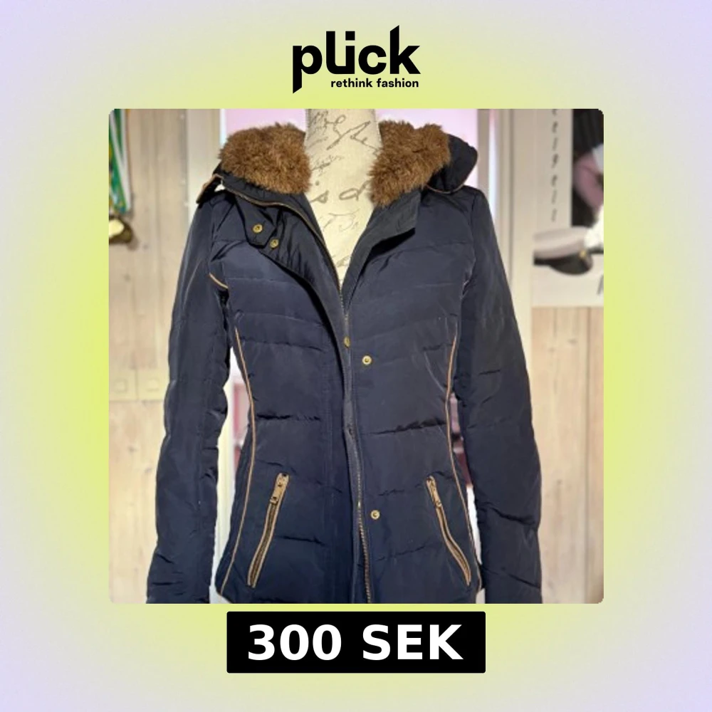 Säljer en mörkblå pufferjacka från Zara Basic med mysig brun fuskpäls i huvan. Jackan har dragkedjor i guldton vid fickorna och längs framsidan, samt snygga detaljer längs sömmarna. Perfekt för kalla dagar med sin varma och fluffiga känsla. Storlek L, mer som en M.