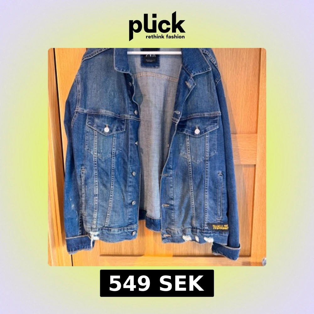 Snygg blå jeansjacka från Zara med coolt grafiskt tryck och text på ryggen. Jackan har klassiska bröstfickor med knappar, slitna detaljer nertill och en relaxed fit. Perfekt för dig som vill sticka ut med streetstyle-vibe.