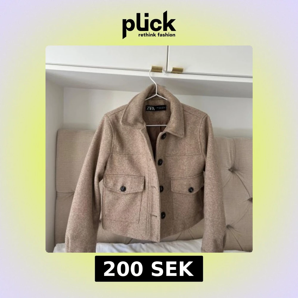 Snygg beige jacka från Zara i ullblandning med klassisk krage och stora knappar framtill. Jackan har två stora fickor med lock och en croppad passform som ger en trendig look. Perfekt för lager-på-lager-stil under höst och vinter.passar mig som annars bär S perfekt.