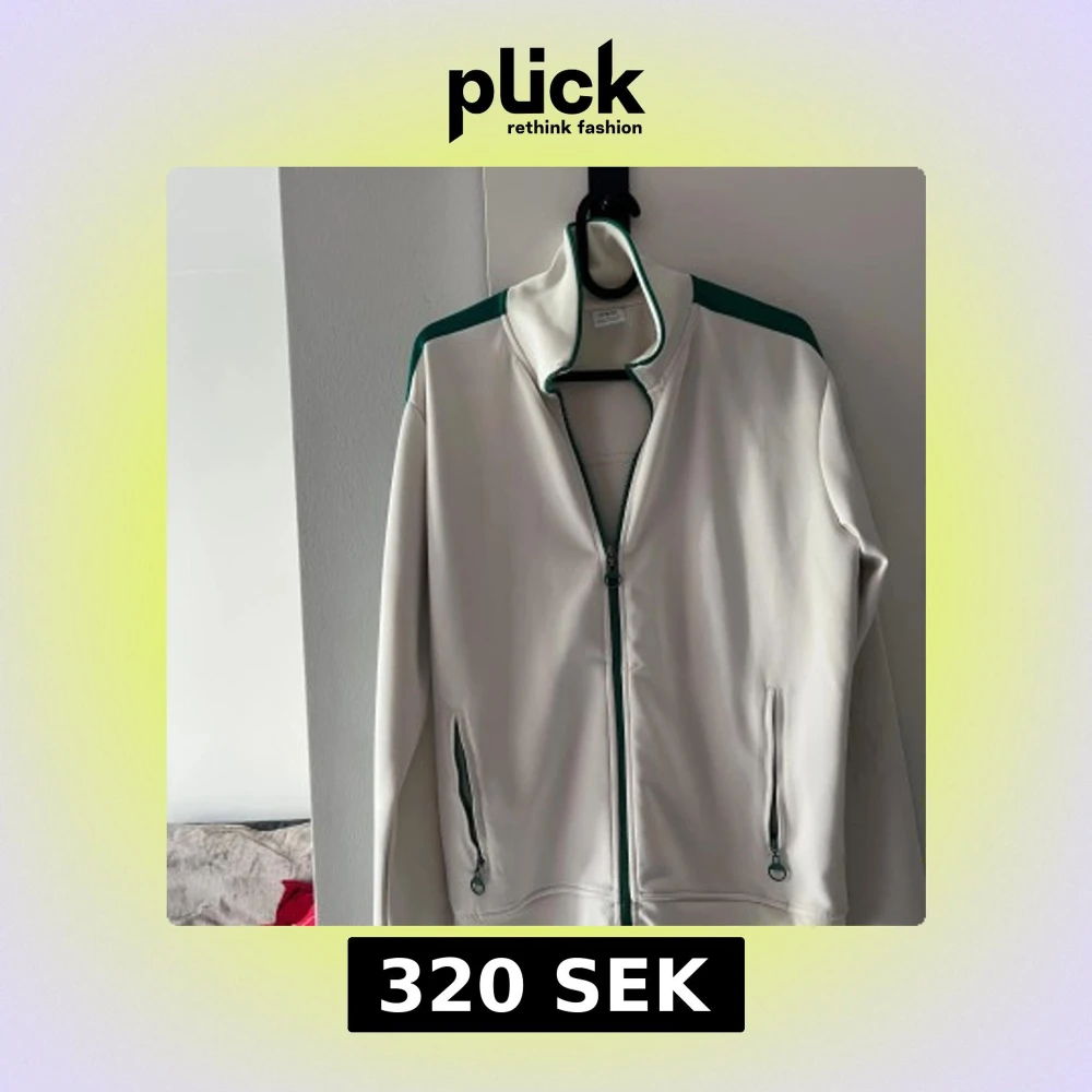 Sportig vit vindjacka från Zara med gröna detaljer längs axlar och dragkedjor. Jackan har hög krage, hel dragkedja framtill och två fickor med dragkedja. Perfekt för en chill och avslappnad stil.