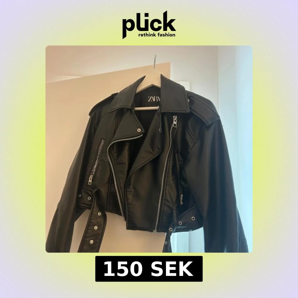 Snygg svart skinnjacka från Zara med klassisk bikerstil. Jackan har silvriga dragkedjor, bred krage och bälte i midjan. Croppad modell med långa ärmar och coola detaljer.