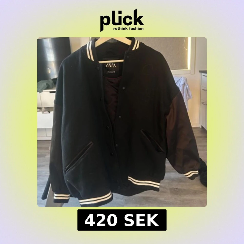 Säljer en svart varsityjacka från Zara med vita ränder på krage, ärmslut och nederkant. Jackan har långa ärmar i kontrasterande material och två snedställda fickor framtill. Klassisk college-look med knappar framtill. Strl xs men är over sides