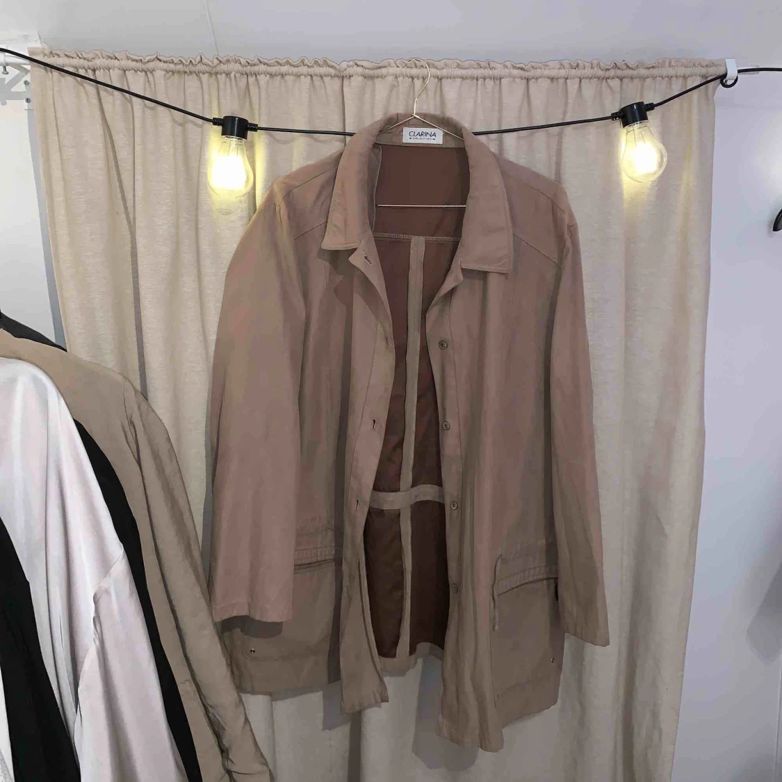 Beige jacka i tunnare material (mocka-liknande). Betalas med swish. Kan mötas upp i Halmstad eller skicka mot frakt som betalas av köparen.