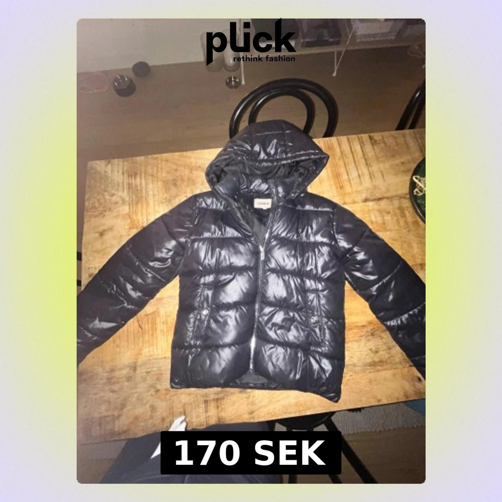 Säljer en svart pufferjacka från ONLY med huva och dragkedja framtill. Jackan har två fickor med knappstängning och ett märke på ena ärmen. Perfekt för kalla dagar och har en snygg, glansig finish. Moncler liknande.