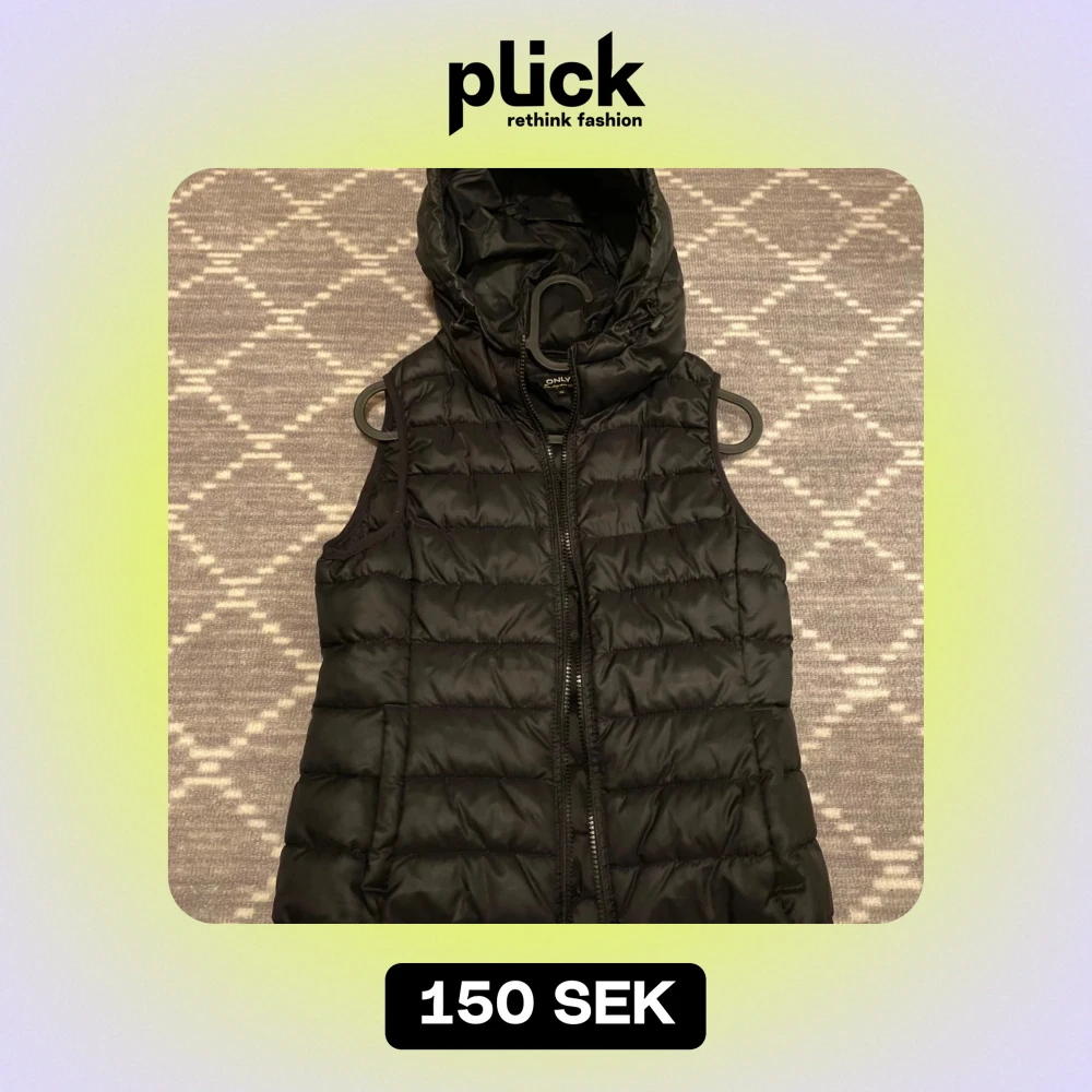 Säljer en svart dunväst från Only i bra skick. Det finns en liten fläck på framsidan, men den är knappt synlig när man har på sig den.