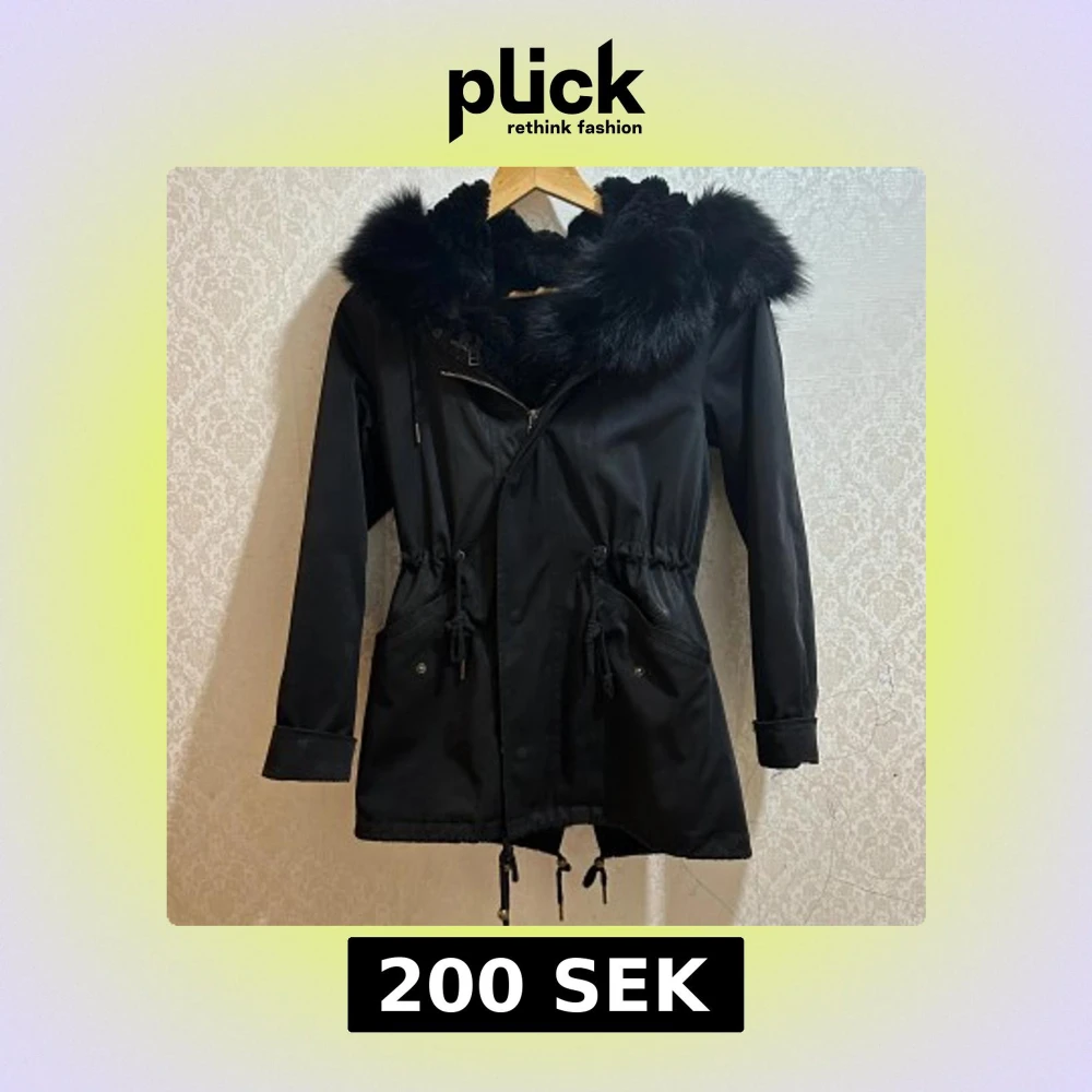 Svart parkajacka med stor huva och bred fuskpäls runt kragen och insidan. Jackan har dragsko i midjan, stora fickor med knappar och dragkedja framtill. Perfekt för kalla dagar och ger en riktigt snygg siluett.