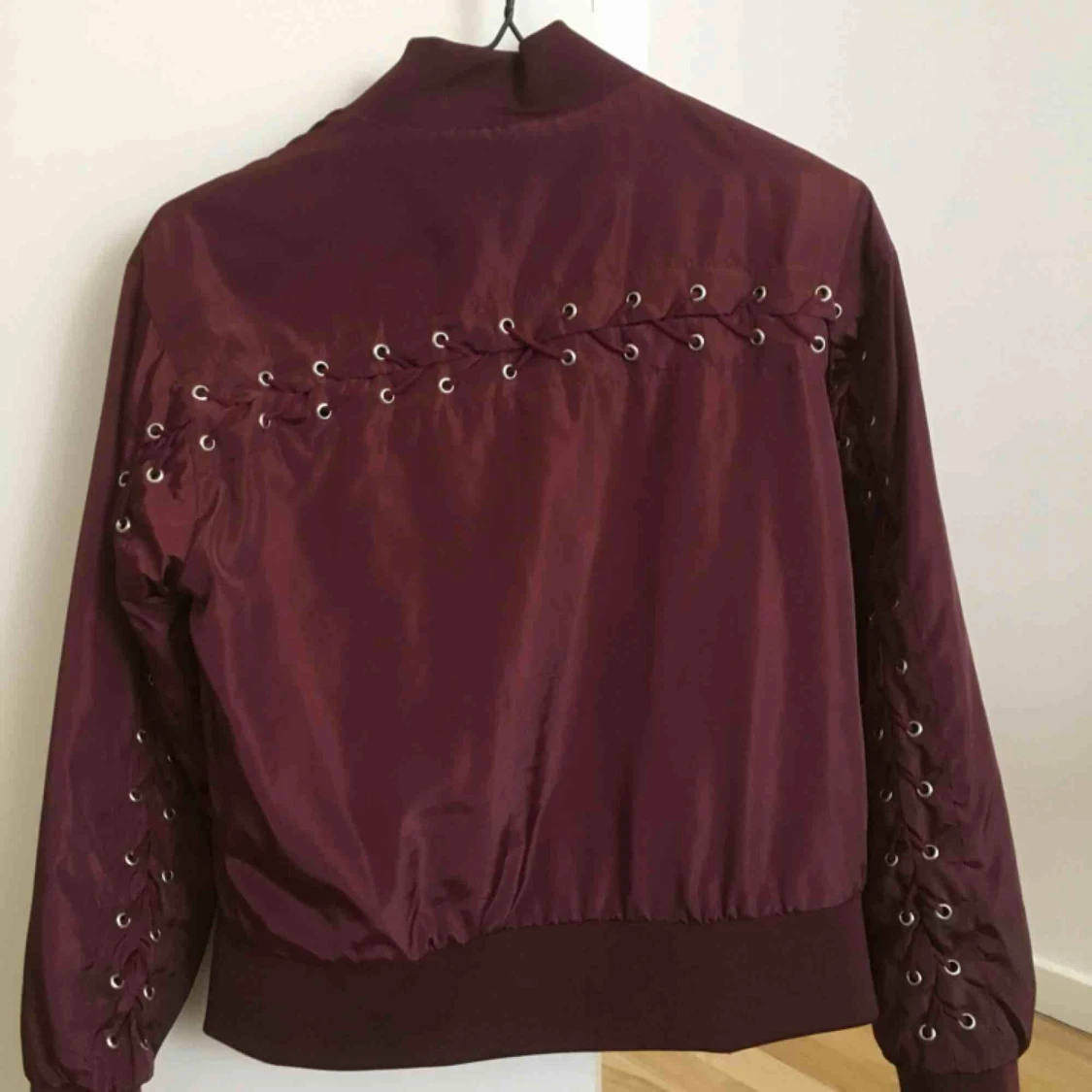 Bombarjacka från NA-KD i gott skick, vinröd i storlek S, med snörning på ryggen. Grymt snygg men kommer tyvärr ej till användning!