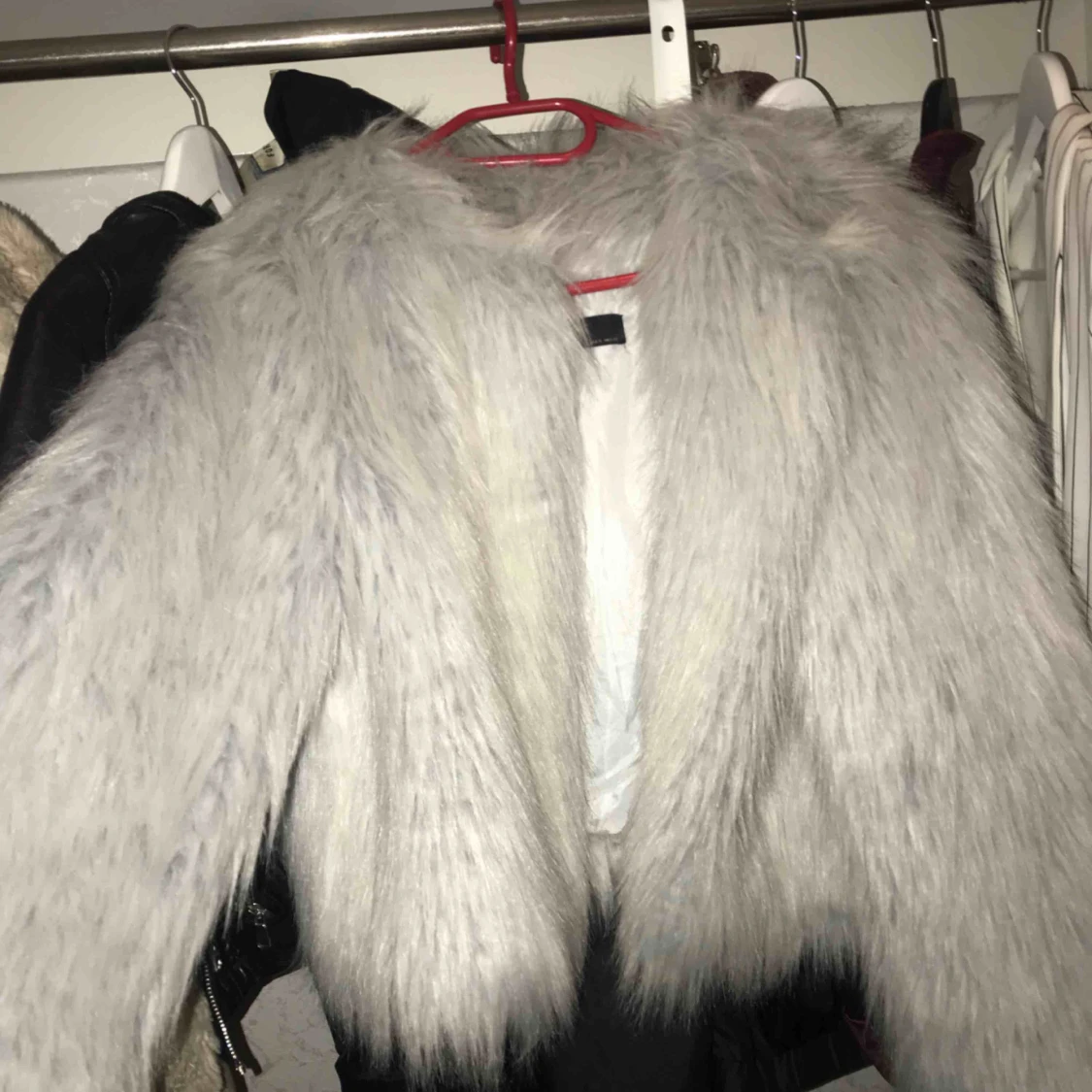 En gråblå pälsjacka från zara, inte äkta päls. Väldigt tjock och varm. det ser ut som att den har lite missfärgningar på bilden men det har den inte i verkligheten.