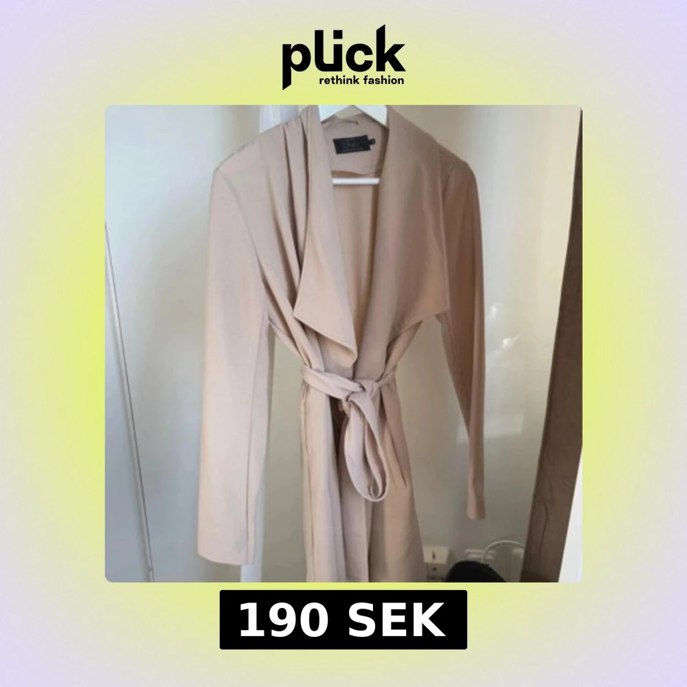 Säljer en stilren beige kappa från ONLY i storlek M. Jackan har lång ärm, bred krage och knyts i midjan med ett bälte för en snygg siluett. Perfekt för dig som vill ha en klassisk och tidlös look.