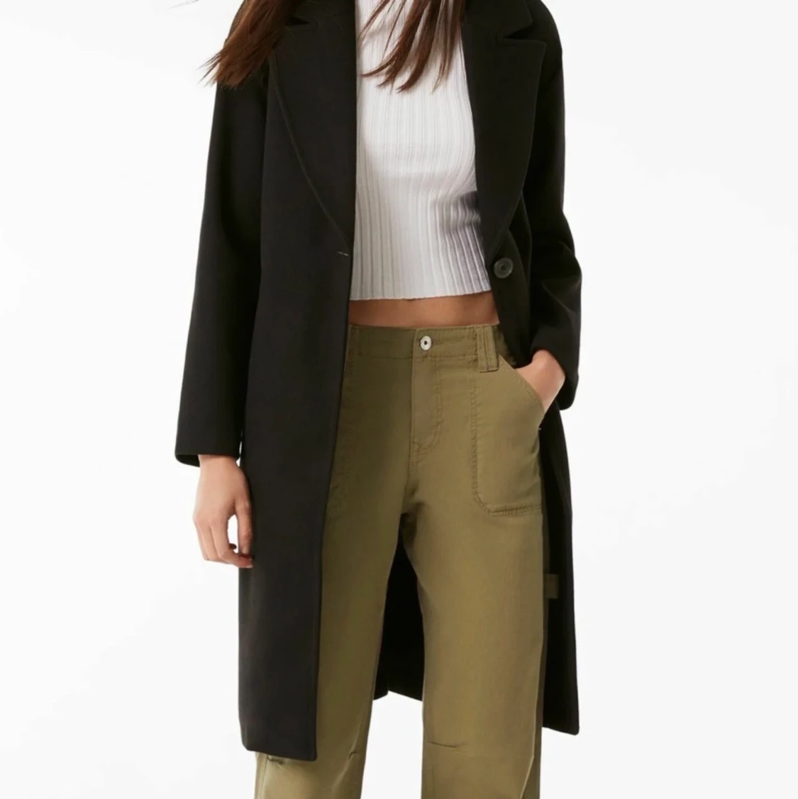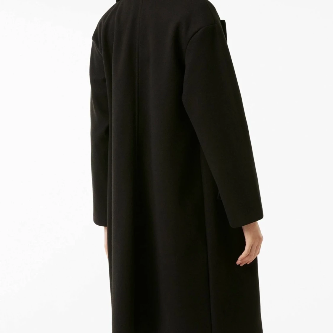 En svart lång kappa. Använd 1 gång, som ny! Bra till hösten/vintern!