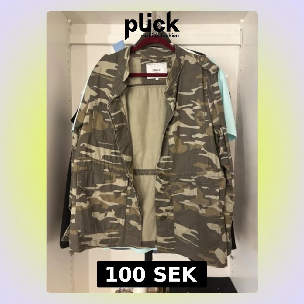 Säljer en camouflagefärgad militärjacka från ONLY med flera stora fickor framtill och knappdetaljer på axlarna.