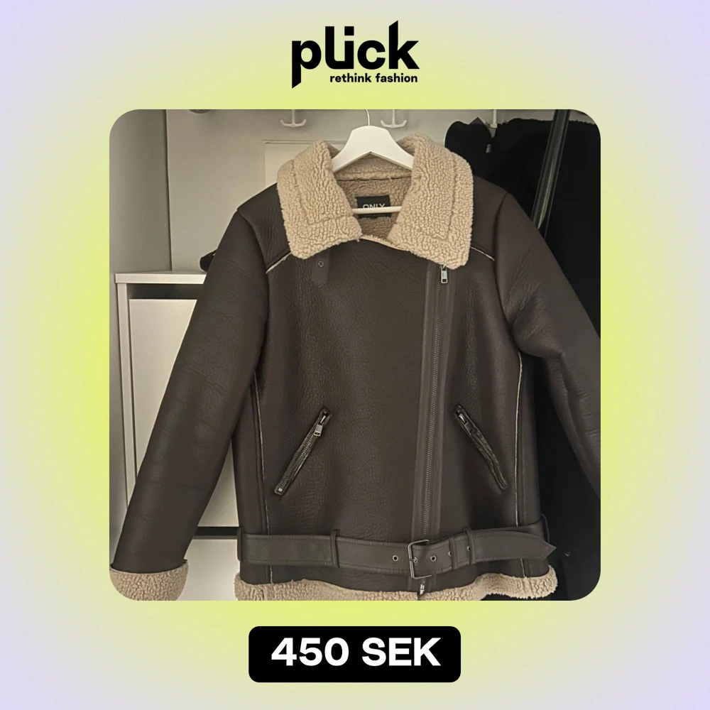Säljer en snygg brun jacka från ONLY i storlek M. Den har ett mysigt teddyfoder och en cool bikerstil med dragkedja och bälte i midjan. Perfekt för höst och vinter! 🧥