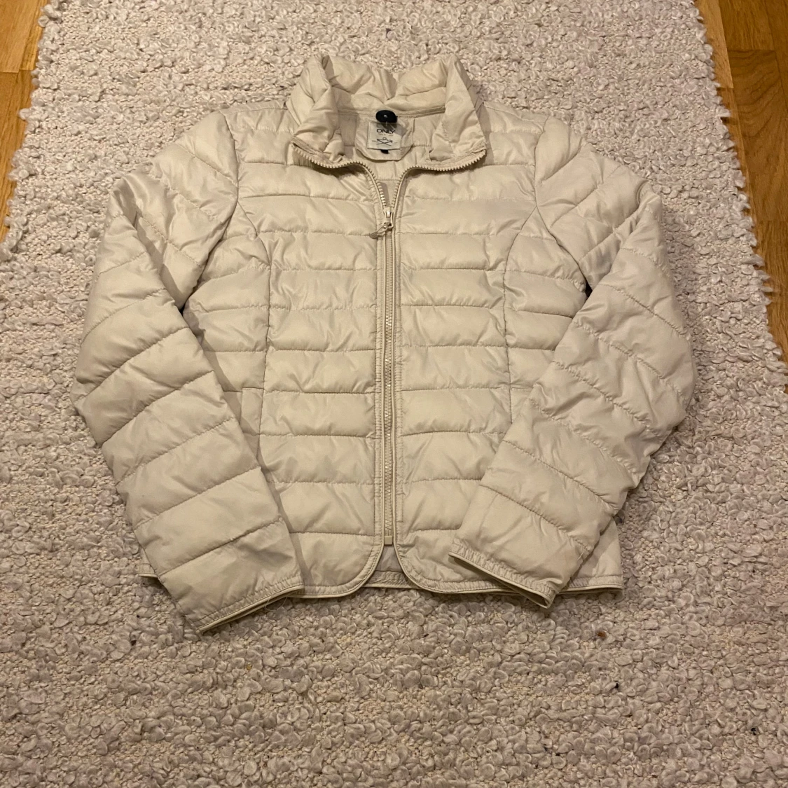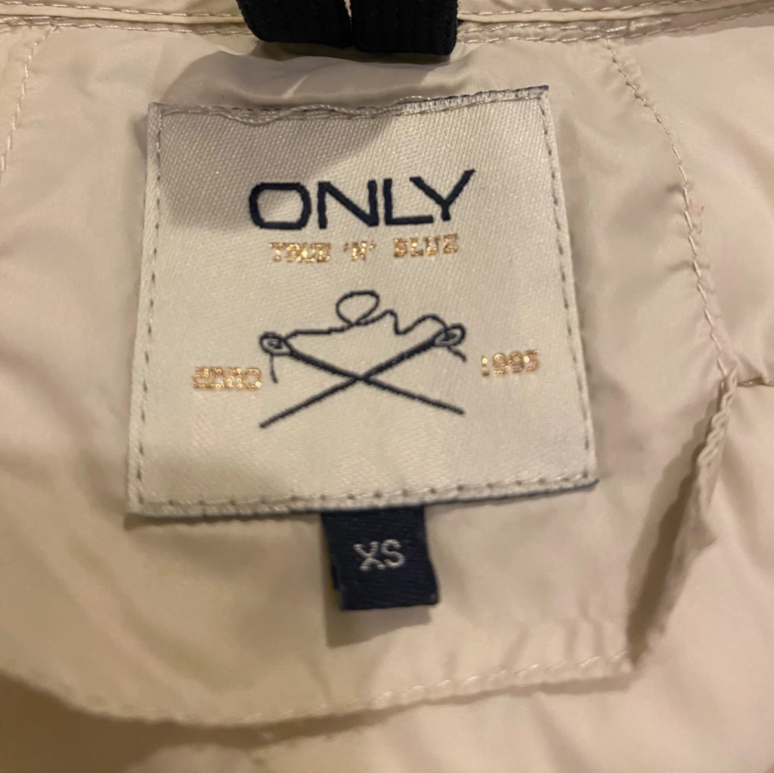 Säljer en stilren vit pufferjacka från Only med quiltad design och dragkedja framtill. Jackan har hög krage, lång ärm och är tillverkad i lätt polyester. Perfekt för kyliga dagar när du vill hålla värmen och ändå se fräsch ut.