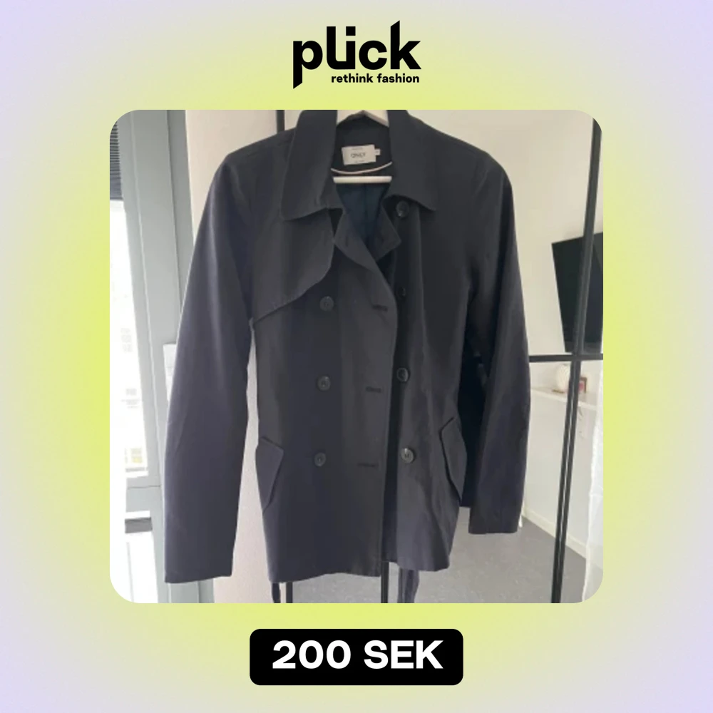 Säljer en stilren svart kappa från ONLY. Den har en klassisk design med knappar framtill och ett bälte i midjan för en snygg passform. Perfekt för höst och vår. Jackan är i bra skick och är knappt använd!