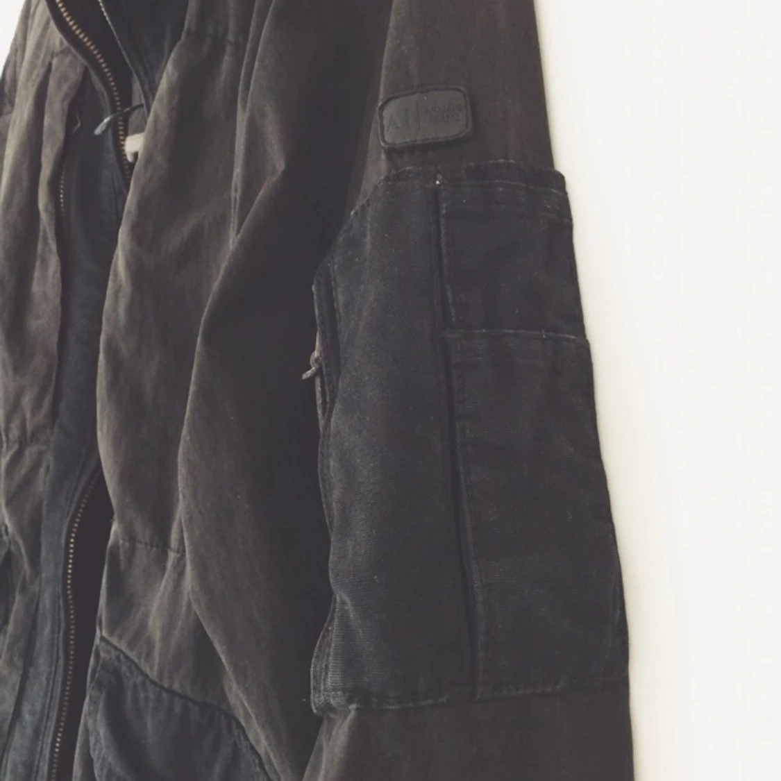 Svart Armani-jacka i bomull som är ytbehandlad på något sätt. Skön känsla i tyget. Använt ganska lite i en sommar. Dragkedjor i bronsig färg.