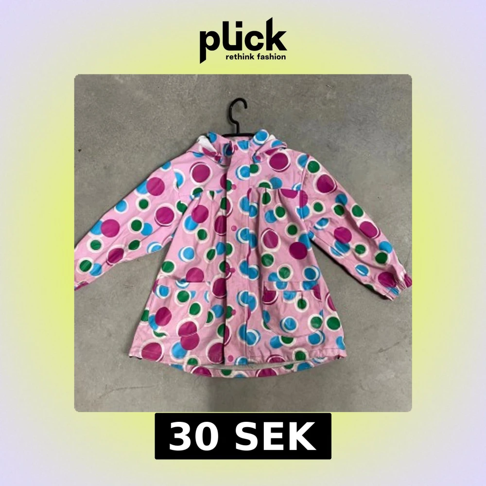 Snygg rosa regnjacka med stora färgglada prickar i blått, grönt och cerise. Jackan har huva, två stora fickor framtill och dragkedja. Perfekt för regniga dagar och sticker verkligen ut med sitt lekfulla mönster.