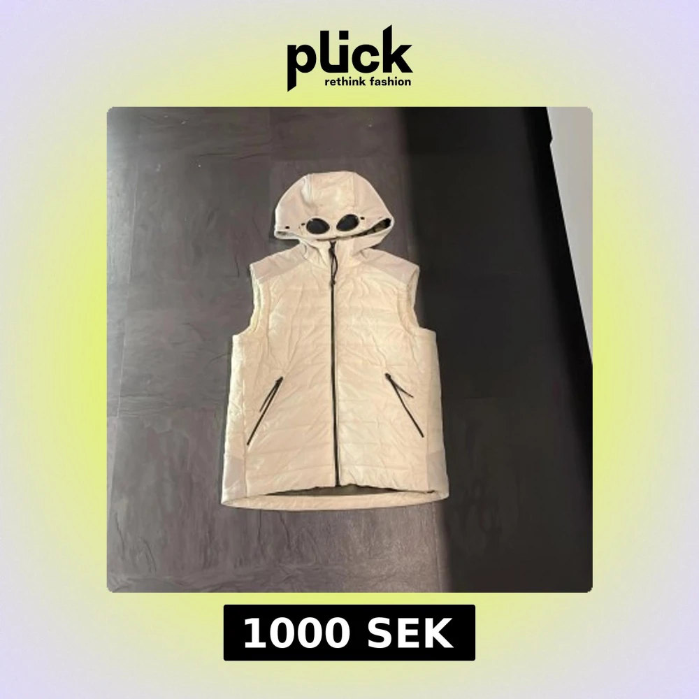 Säljer en stilren vit väst från C.P. Company. Västen har en unik huva med inbyggda glasögon och dragkedja framtill. Perfekt för en cool och modern look. Köpt på NK. En liten reva fins på vänster sidan av luvan se bild.