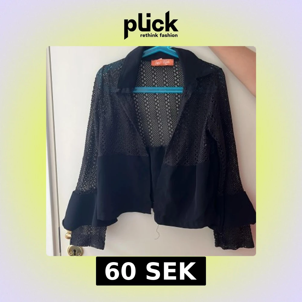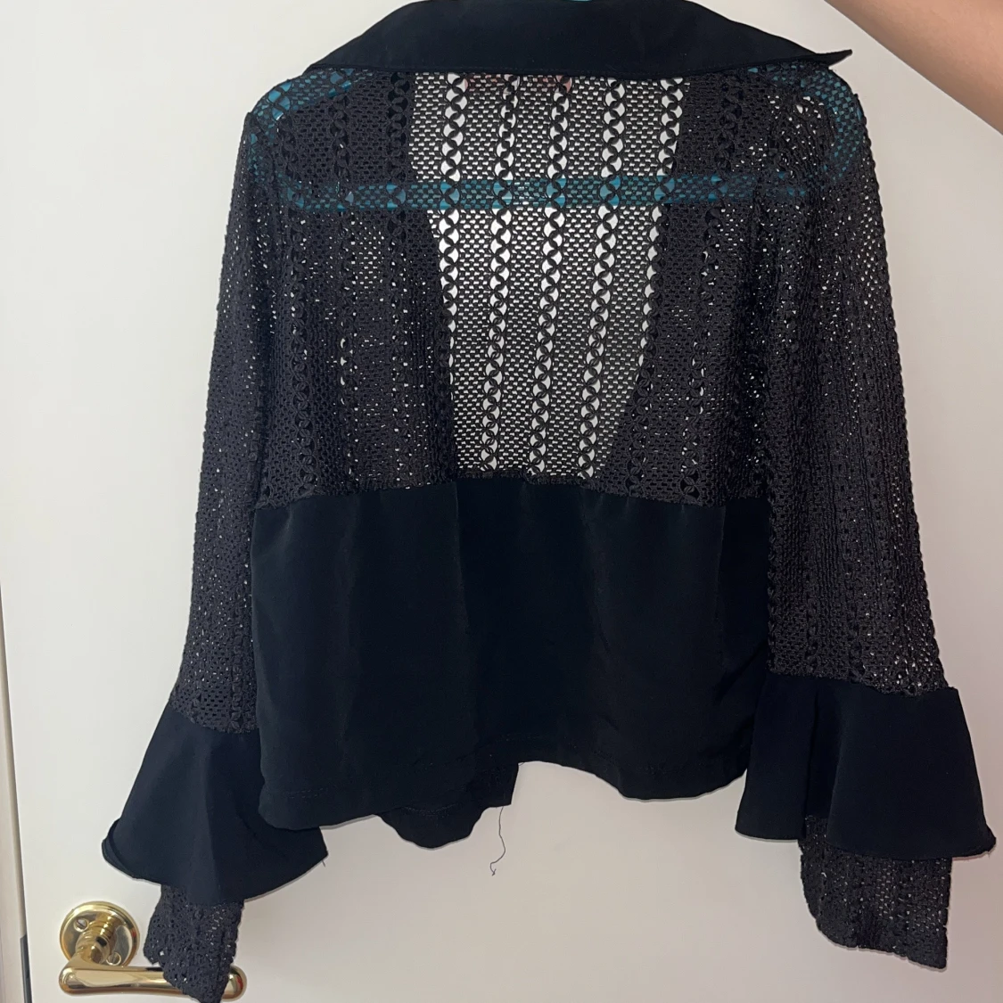 Snygg svart overshirt från Inai Kids med genombrutna spetsdetaljer och breda volangärmar. Jackan har krage och är tillverkad i ett lätt, syntetiskt material som ger en luftig känsla. Perfekt för att lyfta vilken outfit som helst.