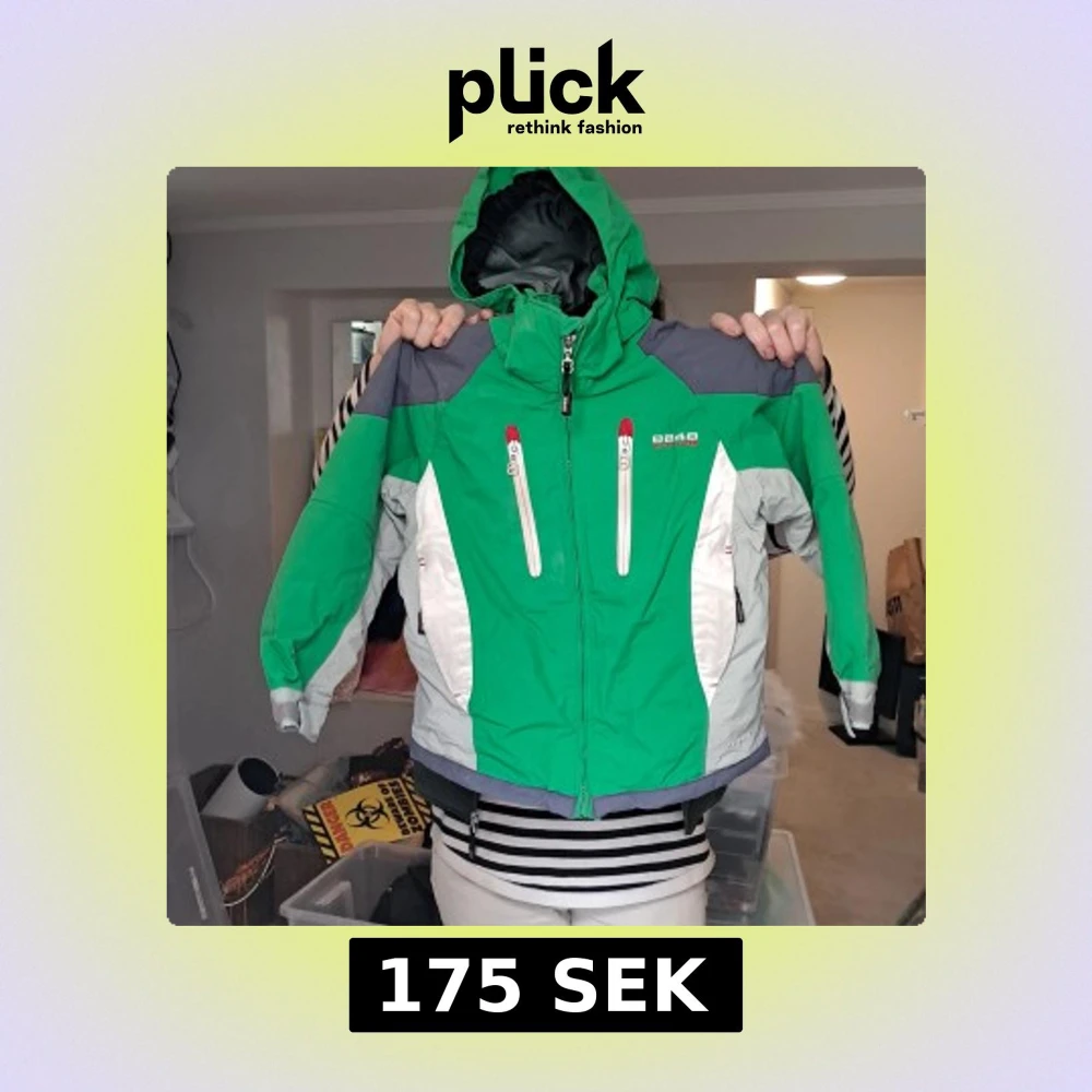 Säljer en grön skaljacka från 8848 Altitude med grå och vita detaljer. Jackan har huva, dragkedjor framtill och två stora fickor med vita dragkedjor. Perfekt för utomhusaktiviteter under kyligare dagar.