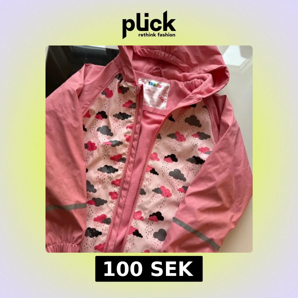 Söt rosa regnjacka från Lupilu med huva och dragkedja. Jackan har ett gulligt mönster med moln och regndroppar i rosa och grått, samt reflexdetaljer på ärmarna. Insidan är fodrad med mjuk fleece för extra komfort.