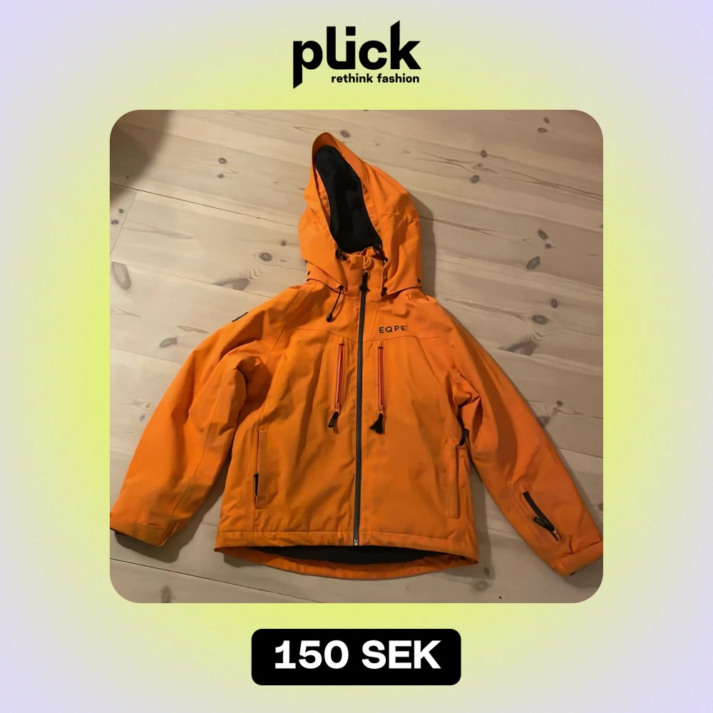 Säljer en snygg orange vindjacka från EQPE. Den har en praktisk huva och dragkedja framtill. Ficka på ärmen för liftkort. Snölås i midjan. Lite sliten med färgskiftningar i sömmar runt ärmar och fickor. I övrigt mycket fin jacka.