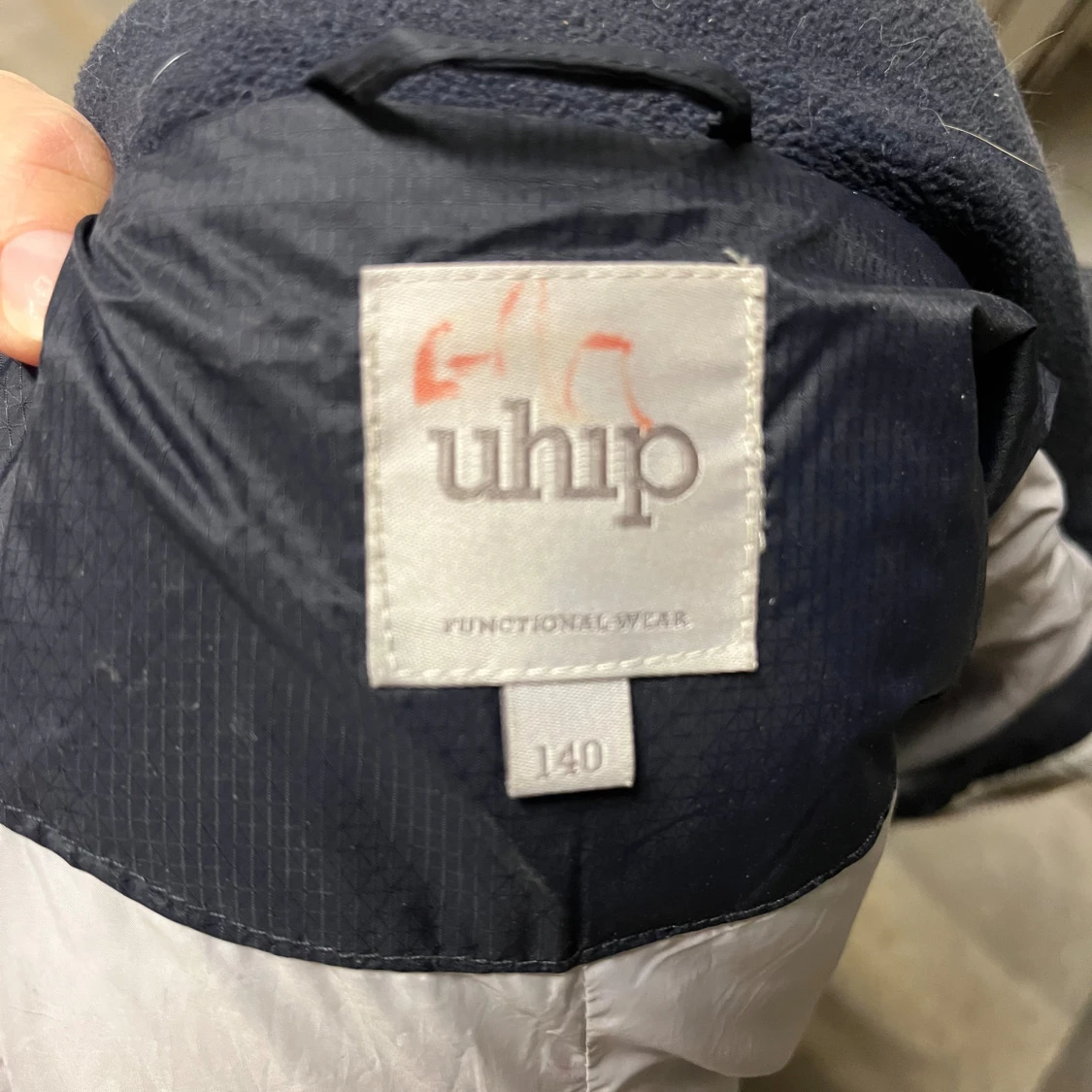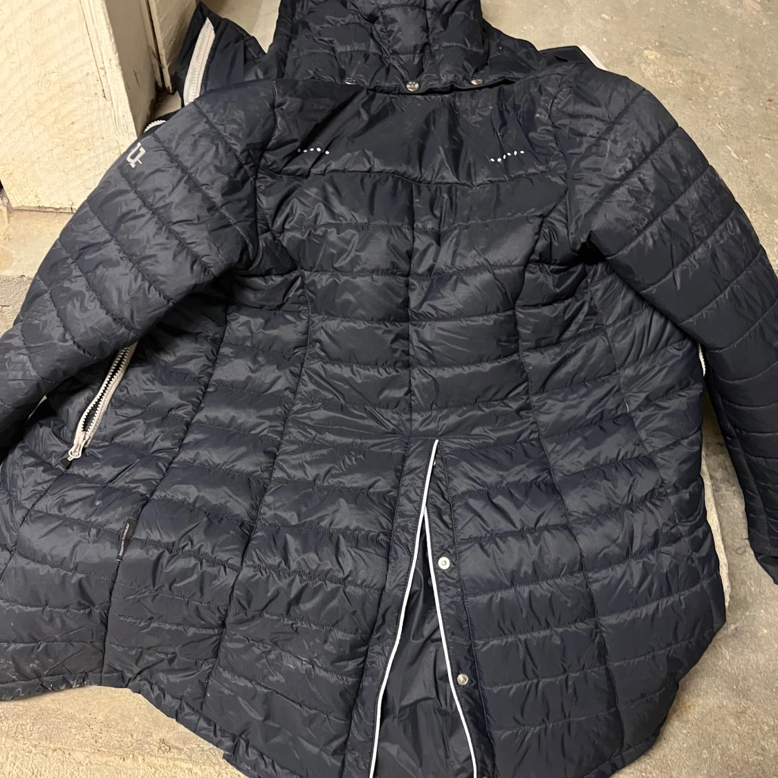 Säljer en mörkblå pufferjacka från Uhip med huva och vita detaljer. Jackan har flera dragkedjor, quiltad design och är lång i modellen. Perfekt för kalla dagar och har en snygg, sportig look med praktiska fickor och reflekterande detaljer.