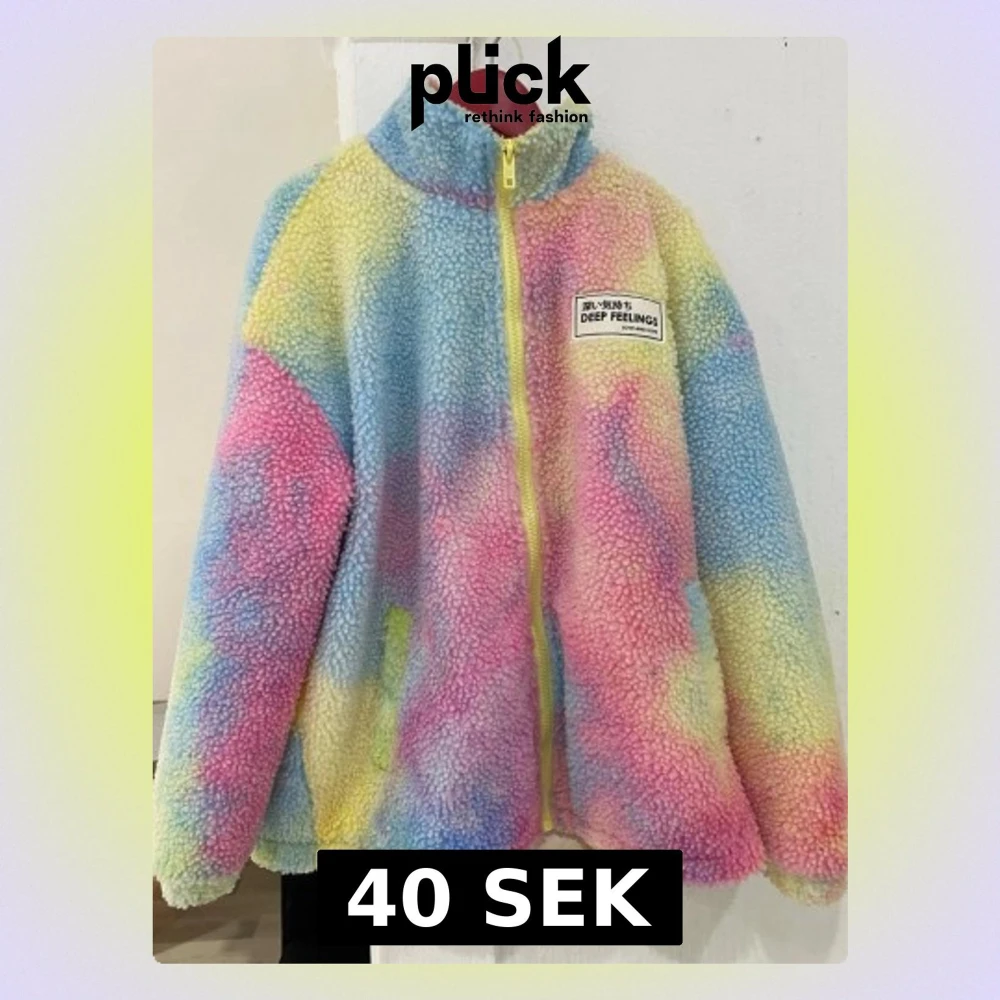 Säljer en fluffig teddyjacka med regnbågsfärgade toner i blått, rosa, gult och lila. Jackan har hög krage, gul dragkedja och ett patch med texten 'Deep Feelings' på bröstet. Perfekt för dig som gillar mjuka och färgstarka plagg.
