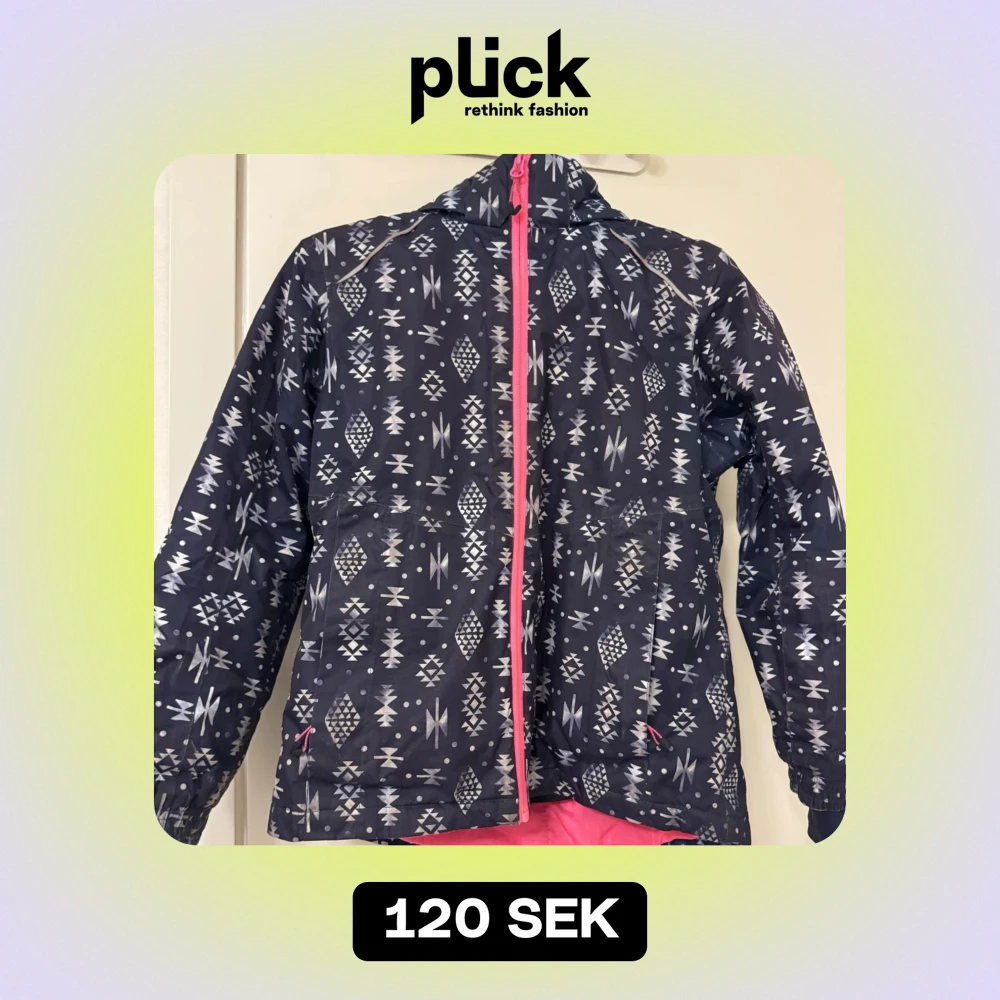 Säljer en cool mönstrad barn- vindjacka i mörkblått med vita geometriska mönster. Jackan har en rosa dragkedja och är perfekt för höst och vår. Den har långa ärmar och en praktisk huva. Perfekt för att hålla sig varm och stilren i blåsigt väder
