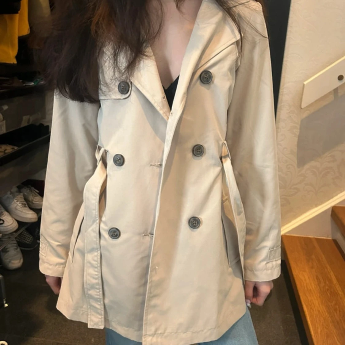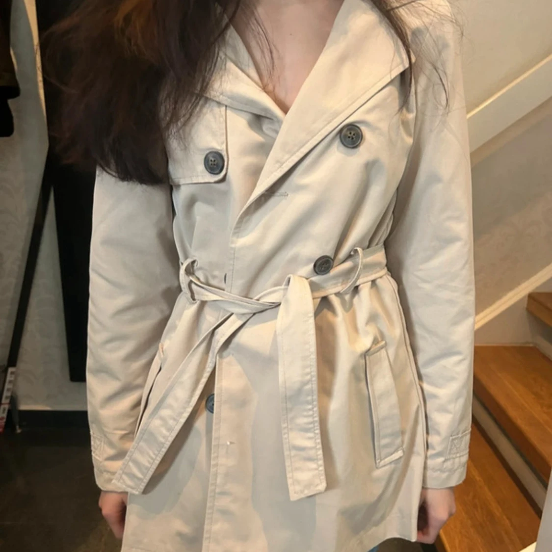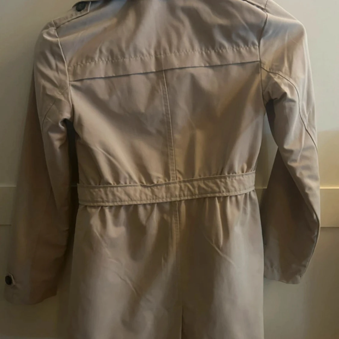 Stilren beige trenchcoat från Name It med klassisk dubbelknäppning, bälte i midjan och stora knappar. Jackan har långa ärmar, två fickor framtill och en snygg krage. Perfekt för dig som vill ha en tidlös och trendig look.